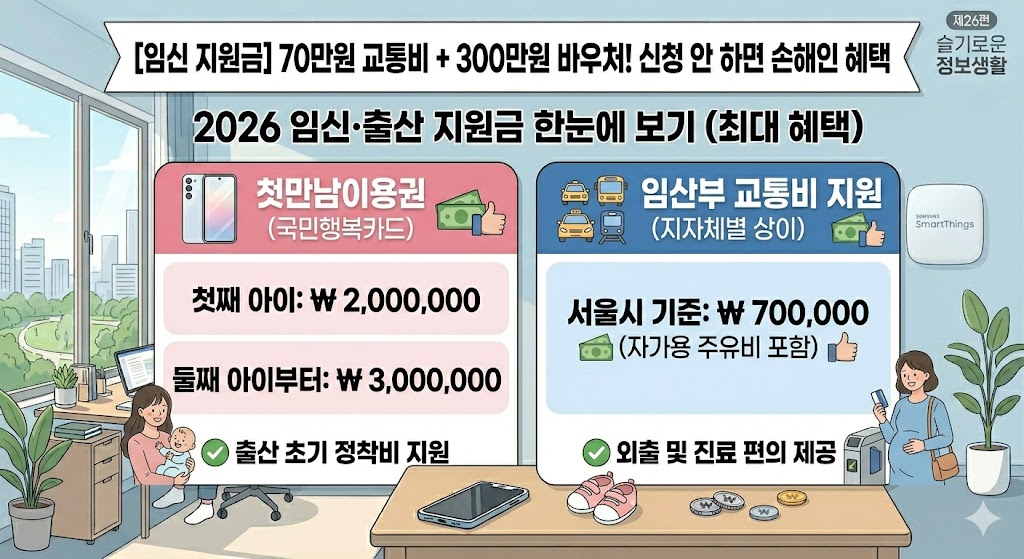 #태그 #임산부교통비지원 #2026첫만남이용권 #맘편한임신통합신청 #임신출산지원금 #국민행복카드바우처 #서울시임산부교통비 #둘째아이300만원 #임신병원비지원 #임산부엽산무료 #슬기로운정보생활 #육아소통 #출산준비물